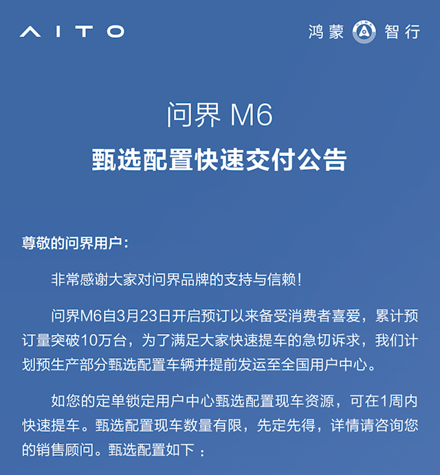 如果你的配置不在甄选清单里,暂时还没法确定提车时间,官方说会在大定开启后公布交付周期,要是急着用车,不妨考虑换成甄选配置,大定开启时间等官方通知就行。