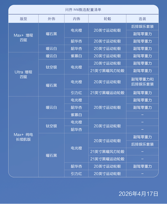 甄选配置涵盖了三个版型,分别是Max+增程四驱、Ultra增程四驱和Max+纯电长续航版,每个版型都有多种外饰、内饰和轮毂可选,还有副驾零重力、后排娱乐套装这些选装配置,能满足不同人的需求。